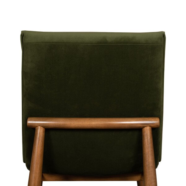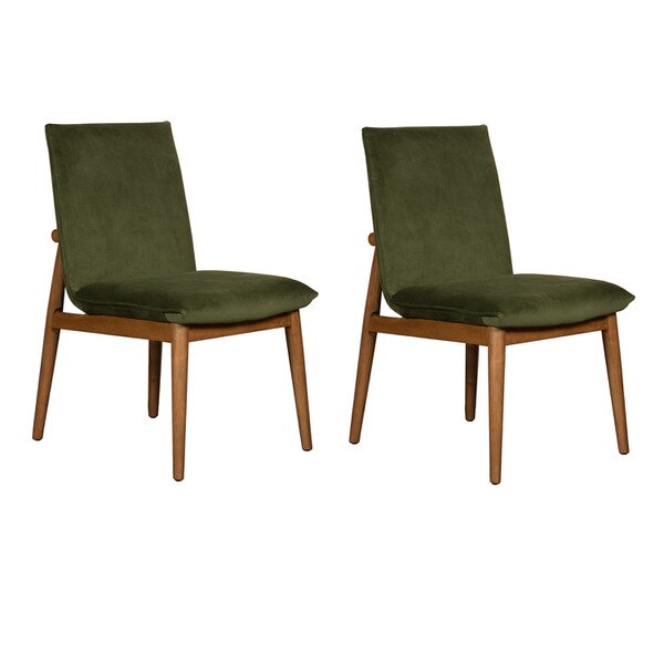 A distinct design statement in the back and upholstered comfort in the front. This modern set of two dining chairs offers bold personality and timeless structure. The solid rubberwood frame, finished in a warm medium tone, contrasts beautifully with plush green velvet upholstery that makes a subtle yet confident color statement. A horizontal bar accent at the back adds sculptural interest, while the generously padded seat and backrest provide inviting support. Perfect for layering into contemporary, bohemian, or eclectic interiors, these chairs bring depth, warmth, and comfort to the table.