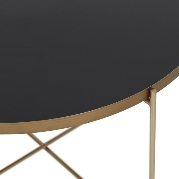 The minimal silhouette and round tray top show off this coffee table's brushed gold finish and rich enamel top of deep black or indigo blue. The tray top design is inspired by classic Moroccan tea tables, and the linear, open base brings some midcentury modern style to your living room. The collapsible table base folds, making it easy to store when you need additional space, while the removable top can be used as a serving tray for entertaining guests. Perfect versatility for smaller living spaces at an unbeatable price.