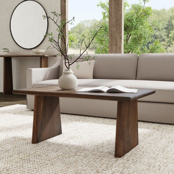 Handcrafted from solid wood planks, each with unique grain patterns, this modern organic coffee table makes a one-of-a-kind contemporary statement piece for your living space. The minimal design features an angular base of trapezoid-shaped legs and a long, rectangular tabletop, all made from sustainable mango wood with rounded edges carved to enhance the beauty of the natural materials. This versatile coffee table fits a range of interior design styles, from earthy California 70s organic to coastal beach house.